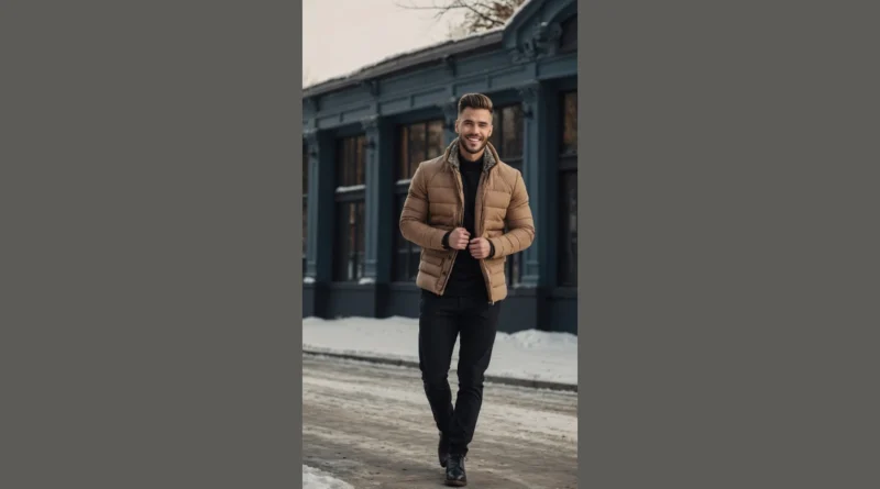 Forget shivering through winter in your old hoodie! This guy is showing us how to absolutely crush the cold weather style game. He’s rocking a super comfy-looking tan puffer jacket with a cool faux fur-lined collar over a sleek black turtleneck, proving you can be both toasty warm and totally put-together. It’s like he just stepped out of a magazine, ready to grab a hot chocolate or maybe even bravely tackle a snowball fight, all while looking effortlessly cool and sporting a smile that says, “Winter? No problem!”