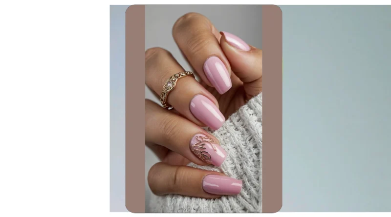 But wait, there’s more! Just when you thought these pink beauties couldn’t get any cooler, check out that fancy gold leaf design on the ring finger. It’s like a tiny piece of art, proving these nails are not just cute, they’re cultured! Paired with that sparkly gold ring, you’ve got a whole ‘glam meets cozy’ situation happening. You could be rocking these nails while conquering your latest video game, or perhaps, you know, writing a really important essay – either way, you’ll look absolutely on point. Who knew a manicure could be so effortlessly extra?