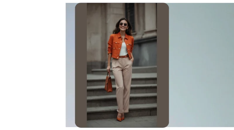 And let’s not ignore that pop of orange! Her jacket, matching bag, and even those sharp heels are all in perfect sync, proving that a little color can turn a simple trousers outfit into a major fashion statement. It’s like she accidentally coordinated everything perfectly just by reaching into her closet, but we all know that kind of effortless style takes a secret superpower. With trousers this versatile, you could totally rock them to school, a fancy event, or even a super important pizza-eating contest. She’s basically showing us how to look polished without trying too hard – the dream, right?